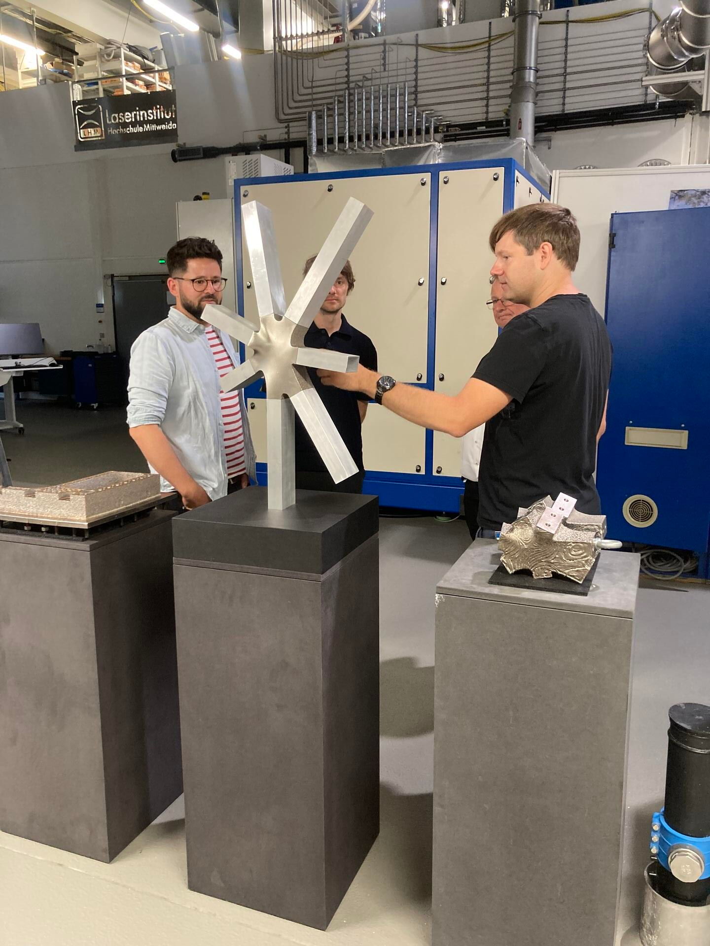 Die dritte Station des Besuches war das Laserinstitut. Am Laserinstitut Hochschule Mittweida haben unsere Gäste durch Michael Pfeifer, wissenschaftlicher Mitarbeiter aus dem Transferfeld Produktion, einen Überblick über die verschiedenen Lasertechnologien an denen aktuell geforscht wird, erhalten. Darunter auch ein mittels Makro-SLM 3d-gedruckter Verbindungsknoten aus einer Freiformfassade der in Zusammenarbeit von Laserinstitut Hochschule Mittweida (LHM) und FLEX.Research entstand.