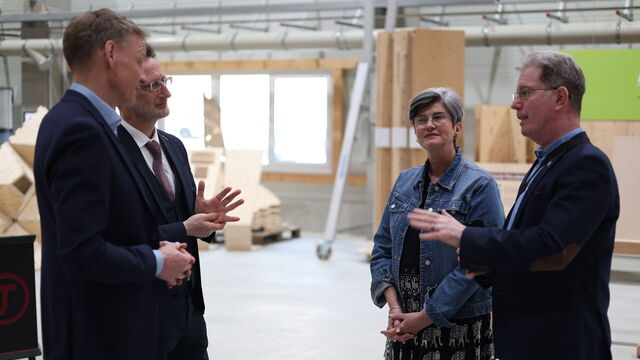Im HolzBauForschungsZentrum der HTWK Leipzig empfingen HTWK-Rektor Prof. Dr.-Ing. Jean-Alexander Müller sowie der wissenschaftliche Leiter der Forschungshalle, Prof. Dr.-Ing. Alexander Stahr, und sein Team von der Forschungsgruppe FLEX am 9. März 2026 hohen Besuch: Andries Oosthuizen, der Botschafter der Republik Südafrika in Deutschland, und Prof. Dr. Wolfram Scharff, Honorarkonsul, kamen auf ihrer zweitägigen Reise durch Sachsen und Sachsen-Anhalt nach Leipzig, um sich hier zum Stand der Forschung im digital basierten Bauen mit Holz sowie über mögliche künftige gemeinsame Forschungsprojekte auszutauschen.