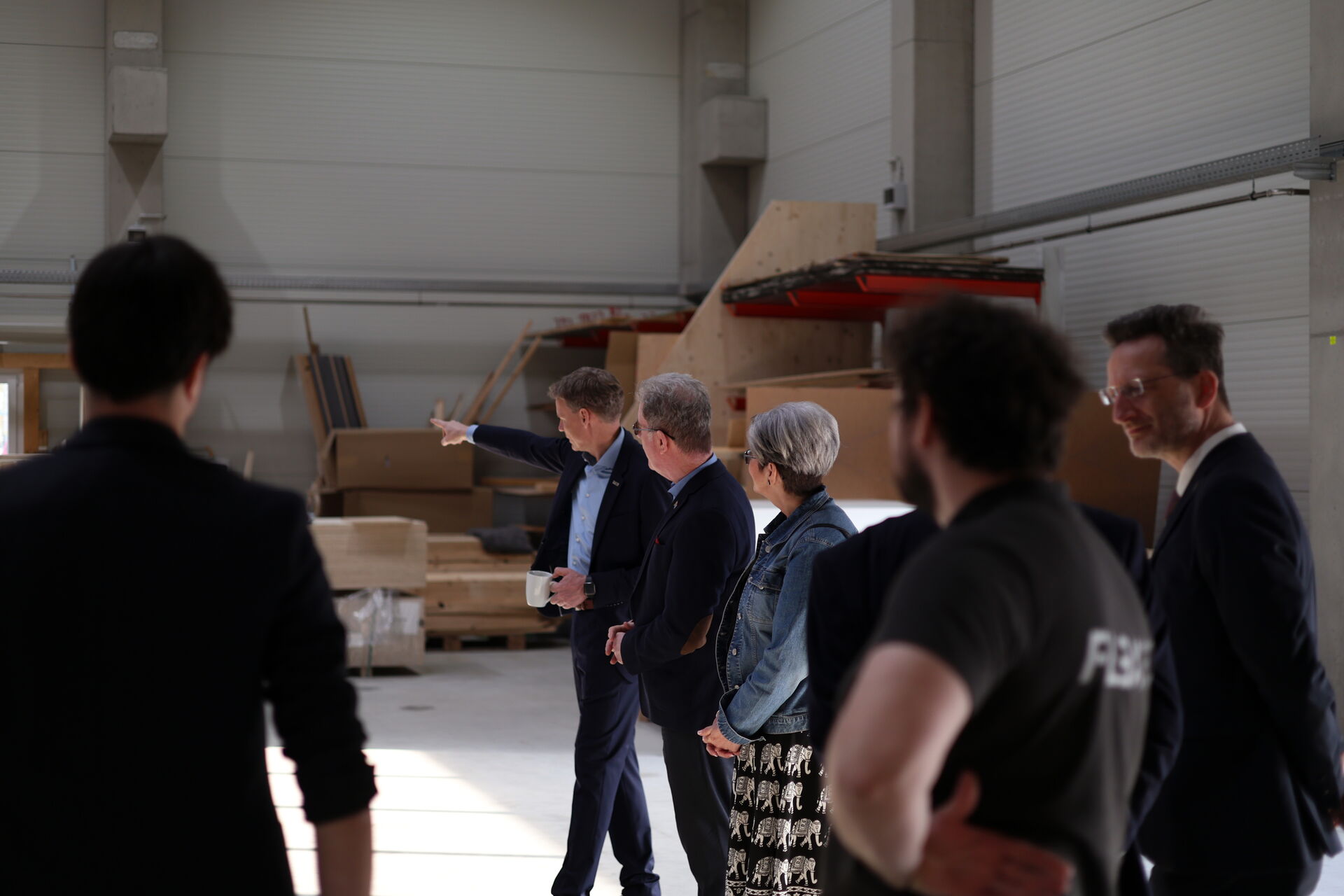 So besichtigen die beiden Vertreter der Republik Südafrika nach einer Begrüßung im HolzBauForschungsZentrum mehrere Stationen: Mit Hinblick auf den bald beginnenden Bau der Krananlage stellten die FLEX-Forschenden zunächst die Vision dazu vor.