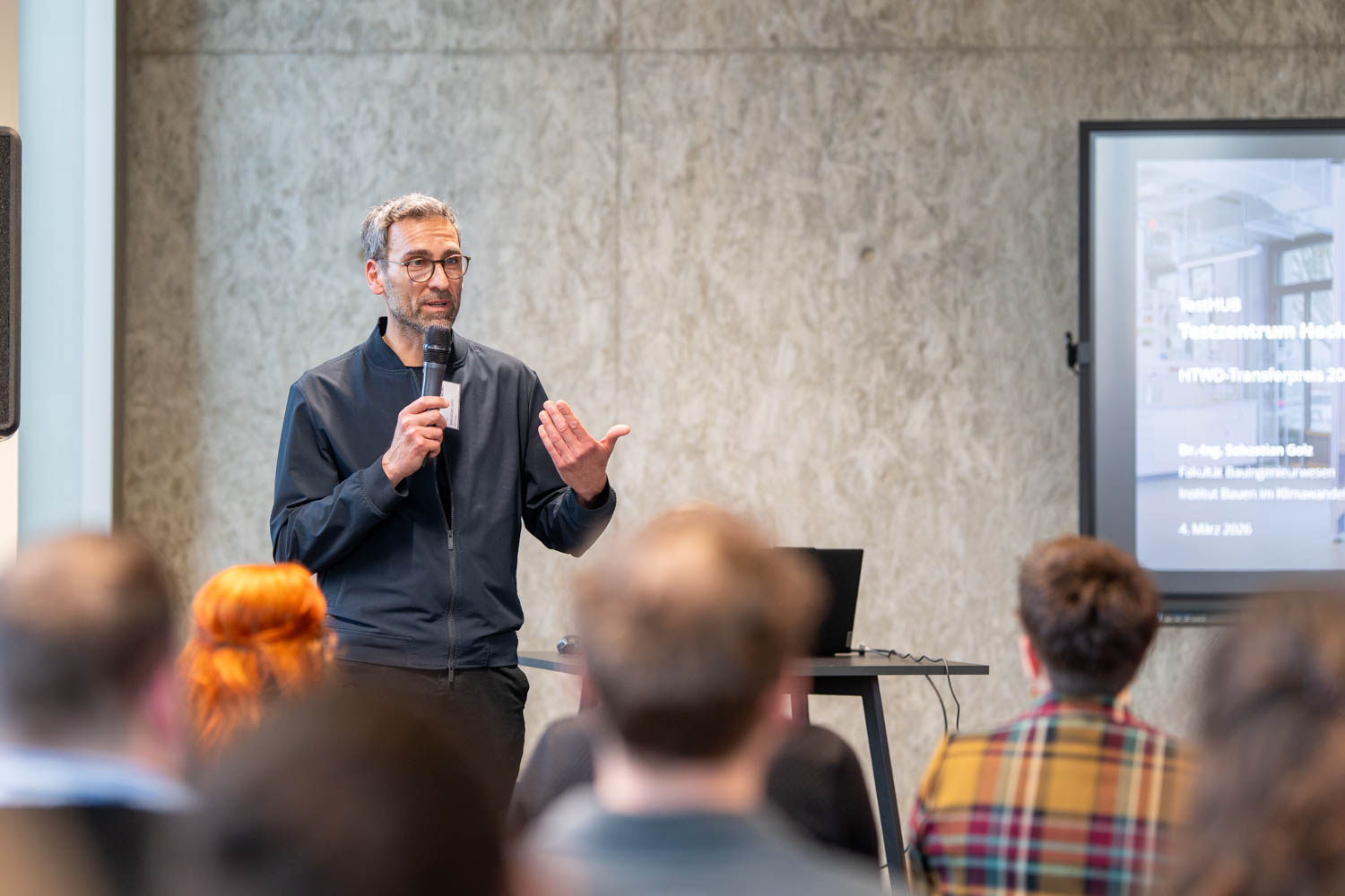 Die Bandbreite der nominierten Projekte spiegelte die gesamte Vielfalt der angewandten Forschung an der HTWD wider. Im Bereich der nachhaltigen Landwirtschaft präsentierte das Team um Prof. Karl Wild innovative Ansätze zur Agri-Photovoltaik, während Dr. Sebastian Golz mit dem Testzentrum „Hochwasserangepasstes Bauen“ (TestHUB) eine bundesweit einmalige Prüfeinrichtung für den Hochwasserschutz vorstellte.