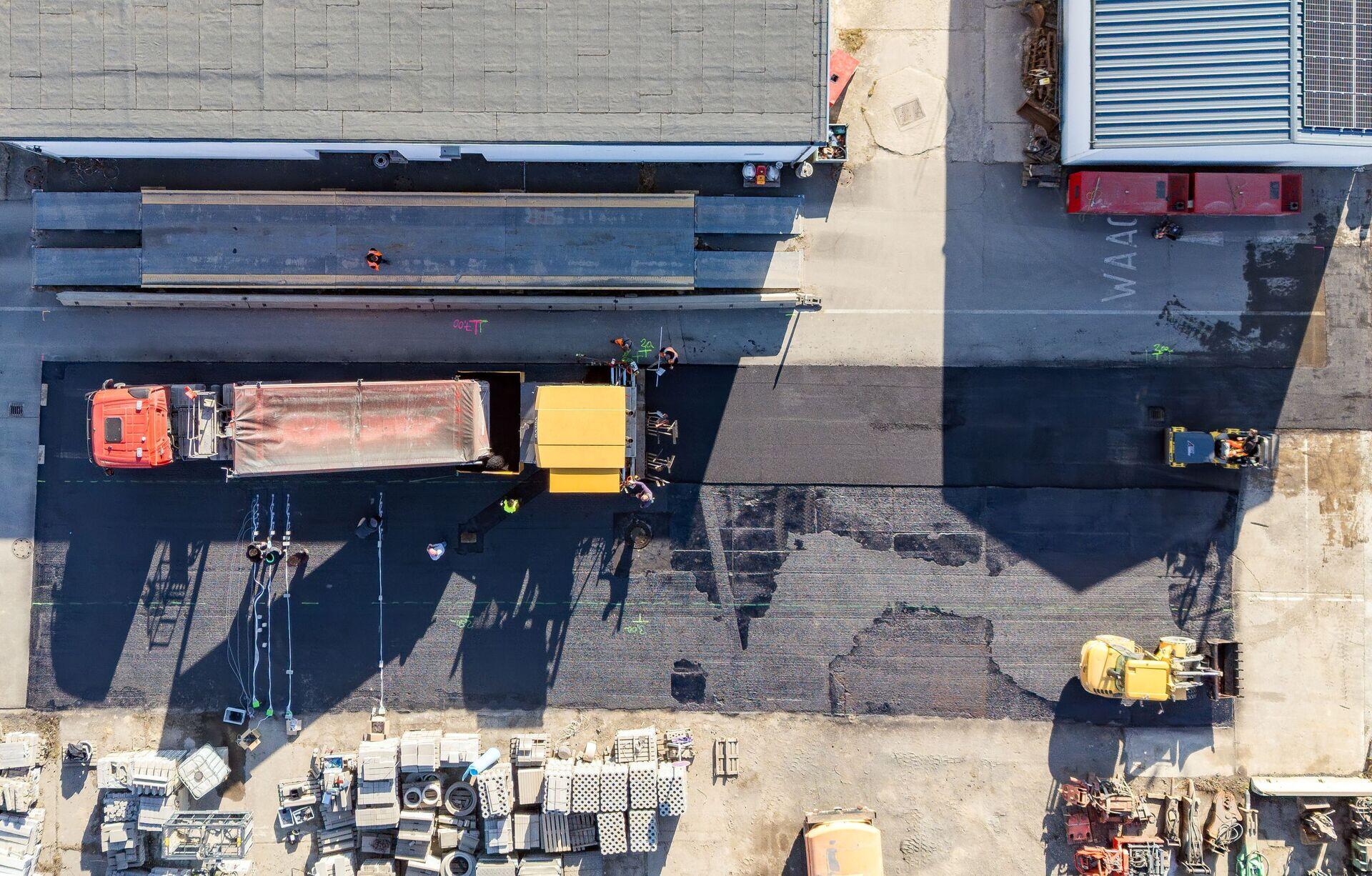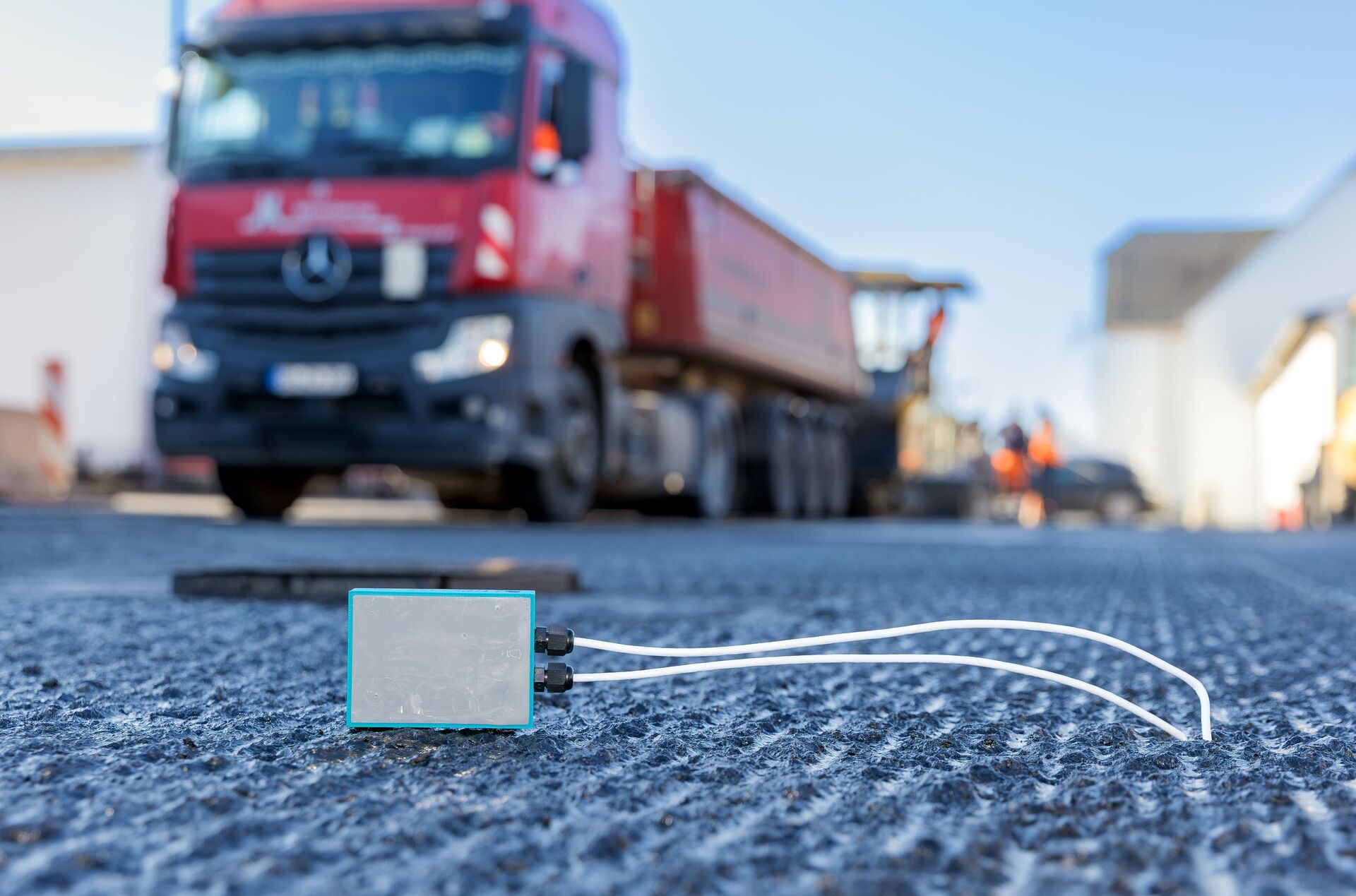 Plötzlich wird es hektisch, als der LKW mit dem Anhänger voller heißem Asphalt sein Ankommen mit lautem Hupen ankündigt. Auf einer Landstraße in Oelzschau bei Rötha, rund 25 Kilometer südlich von Leipzig entfernt, wird damit gleich sensible Technik übergossen. Forschende der Hochschule ziehen auf der aufgefrästen Straßenoberfläche noch die letzten Kabel gerade, die zu einer Messstation führen, und entfernen Blöcke, die zum Beschweren auf den faustgroßen Sensoren liegen. Dann wird es ernst: Der erste Praxistest auf einer öffentlich befahrbaren Straße beginnt.